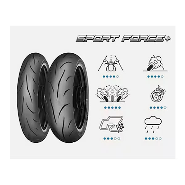 El Mitas Sport Force+ es un neumático deportivo de alto rendimiento diseñado para motocicletas Super Sport, Naked y Street, ideal para quienes buscan un equilibrio entre agarre, estabilidad y durabilidad tanto en carretera como en uso ocasional en pista.